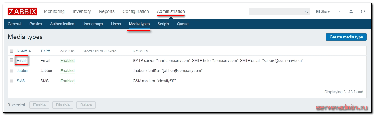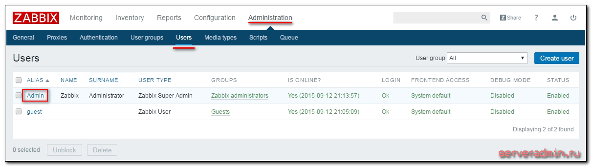 Это мы настроили адрес отправки. Теперь нужно пользователю добавить адрес для получения. Для этого идем в Administration -> Users, выбираем пользователяAdmin.