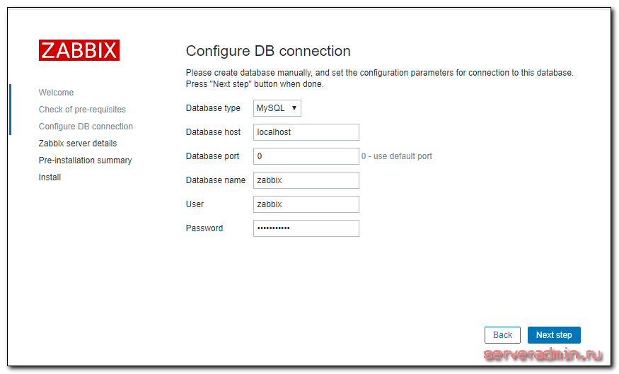 Мы указали серверам Zabbix о нашей базе данных, но веб – интерфейсу Zabbix также необходим доступ к базе данных для управления узлами и чтения данных, поэтому он может показать его нам. Введите учетные данные MySQL настроенные на шаге 2 и нажмите кнопку Следующий шаг, чтобы продолжить.