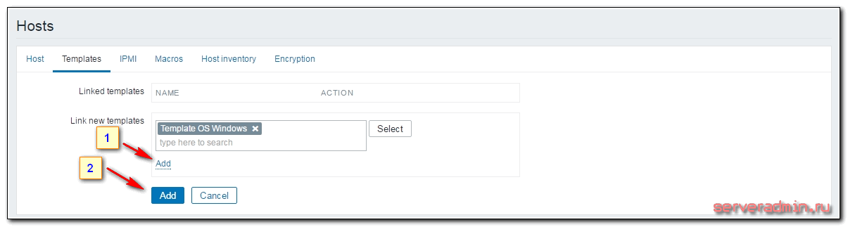 Потом переходим на вкладкуTemplatesи нажимаем Select. Выбираем шаблон Template OS Windowsи жмем маленькую ссылкуadd, затем большую.