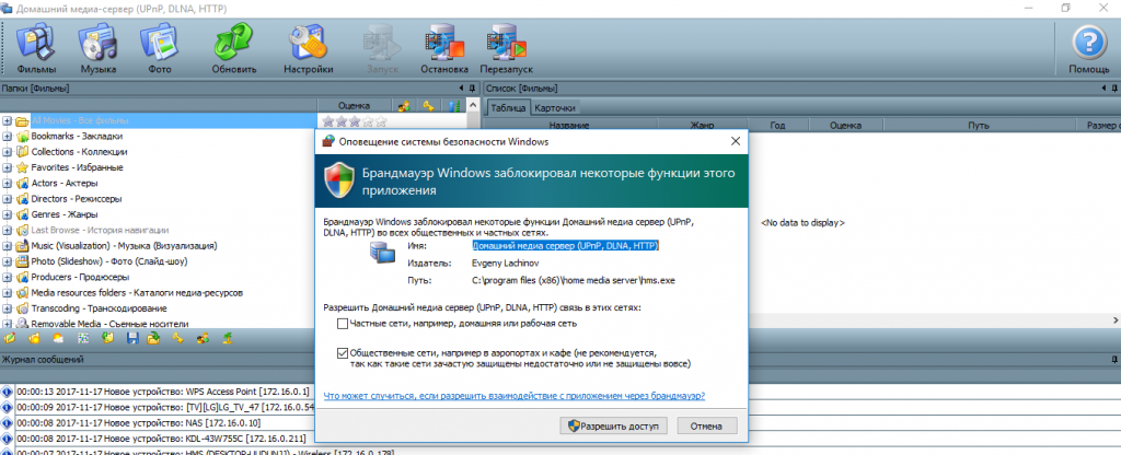 Если у Вас включен «Брандмауэр Windows», то у Вас спросит система, разрешить ли ей доступ в сеть. Выбираем в какие сети разрешить доступ и нажимаем «Разрешить доступ«.
