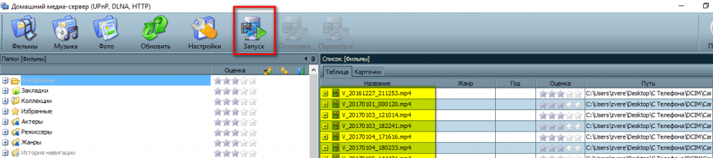 После указания всех настроек можно начинать работать с сервером, и для этого делается клик по кнопке «Запуск», расположенной на верхней панели. После включения ТВ он должен появиться в списке подключенных устройств. Если этого не произошло, необходимо снова запустить процесс сканирования, нажав на «Обновить».
