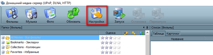 - Устанавливается и запускается программа «Домашний медиа-сервер» на компьютере. Для перехода в настройки следует воспользоваться соответствующей клавишей.