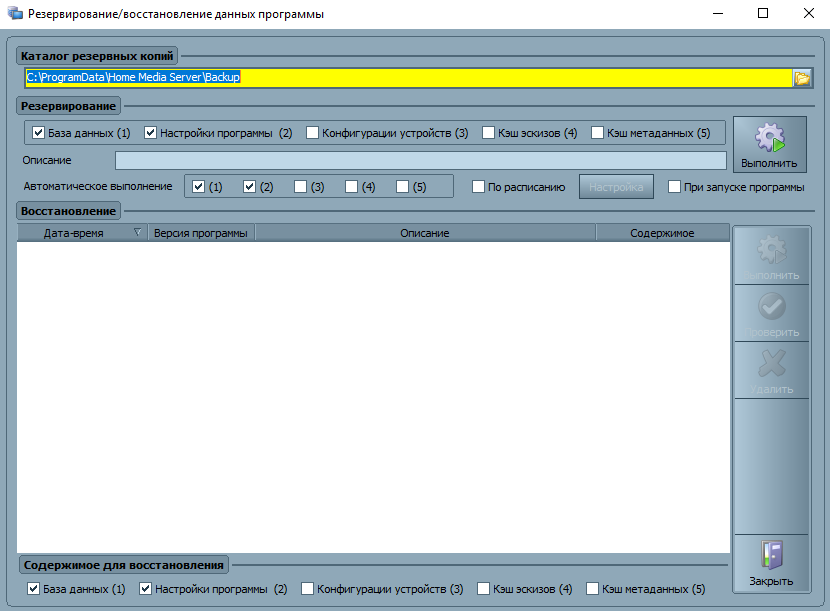 Следующий шаг позволит выполнить настройку системы резервного копирования. Можно оставить предложенную программой директорию либо указать другую. Кроме этого, предоставляется возможность указать, какую информацию необходимо сохранять. Кнопка «Выполнить» запустит этот процесс и после окончания операции нужно нажать на «Закрыть».