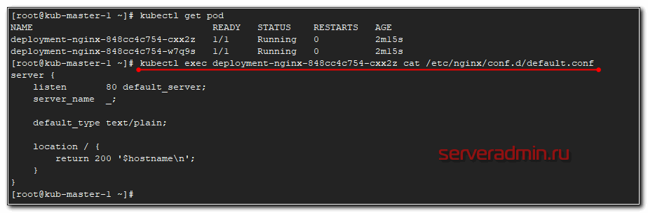 В данном случае это простейший конфиг для nginx, который при обращении к серверу будет отдавать 200-й код ответа и имя сервера. Теперь подключаем его к нашему deployment из предыдущих примеров.