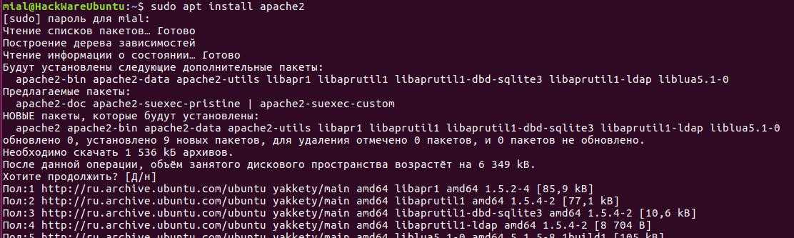 1. Начнём с установки веб-сервера Apache из официальных репозиториев Ubuntu. Это делается командой: