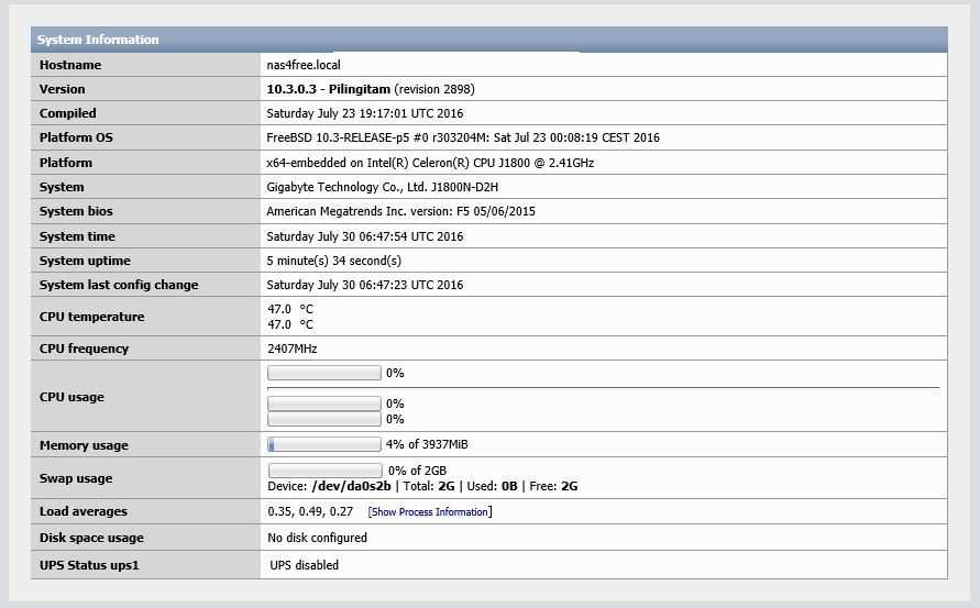 Логин по умолчанию – admin, пароль (кто бы мог подумать) – nas4free. Залогиниваемся и видим системный монитор: