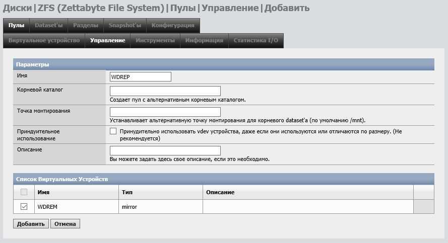 Теперь отправляемся на вкладку “Пулы” и добавляем новый, используя только что созданное виртуальное устройство: