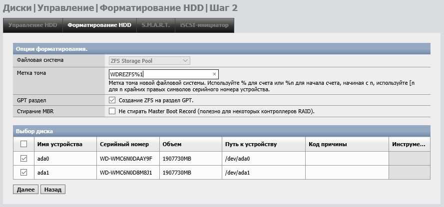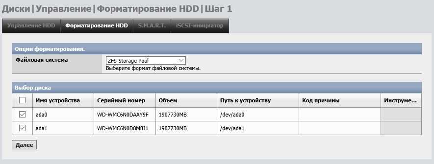 Итак, оба диска Online, все системы работают нормально. Но это только начало пути. Давайте перейдем на вкладку “Форматирование HDD”. Как мы и договаривались в начале статьи, будем использовать ZFS. Выбираем оба накопителя и нажимаем “Далее”: