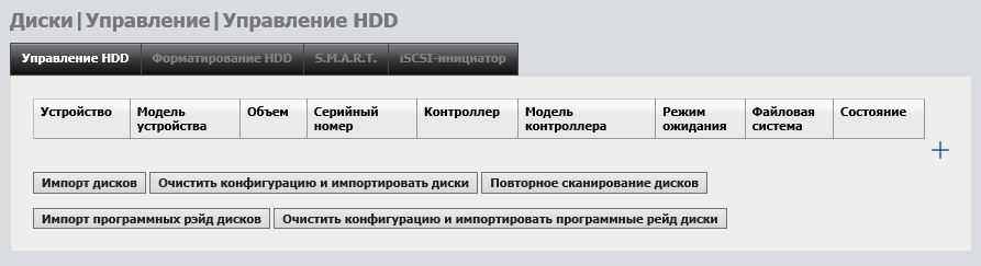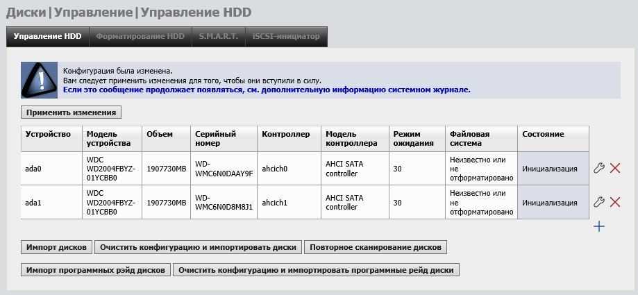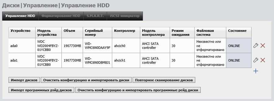 Только без паники – в NAS4Free все нужно делать руками. Самый простой вариант – нажать на “Очистить конфигурацию и импортировать диски”, но я рекомендую нажать на синий плюсик справа и добавлять накопители по одному. Меню выглядит следующим образом: