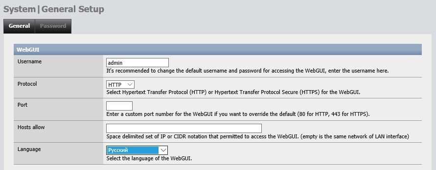 Здесь же можно задать новые имя пользователя и пароль к вебинтерфейсу.