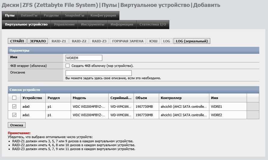 Теперь нам необходимо собрать виртуальное устройство. Идем в “Диски” –> “ZFS” –> “Пулы” –> “Виртуальное устройство”, нажимаем на синий плюс и видим следующую картину: