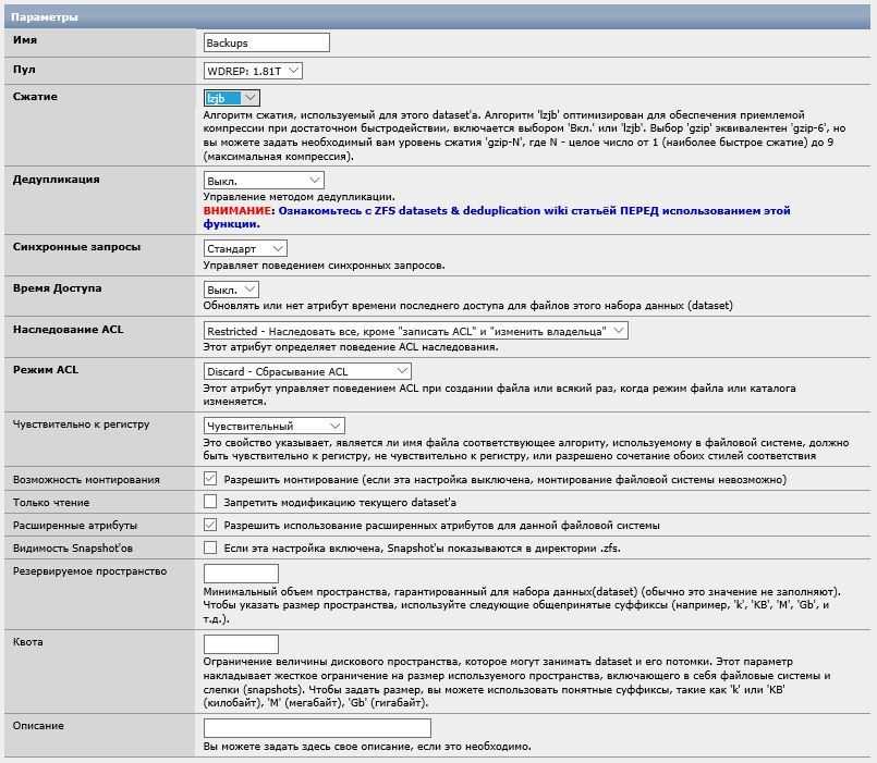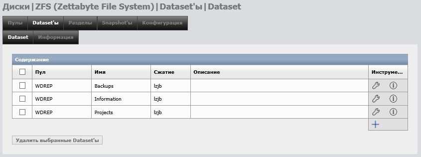 В принципе, уже можно начинать закачивать файлы, но лучше всего воспользоваться главным преимуществом ZFS – возможностью создавать датасеты. По сути, они представляют собой дочерние файловые системы, благодаря чему у нас появляется возможность выбирать для каждого датасета способ сжатия, задавать права доступа и дисковые квоты (что исключит ситуацию, когда ваша видеоколлекция благополучно съест все свободное место под документы), а главное – создавать снэпшоты, позволяющие практически мгновенно восстанавливать утраченную информацию. Поэтому давайте перейдем в “Dataset’ы” и создадим несколько: