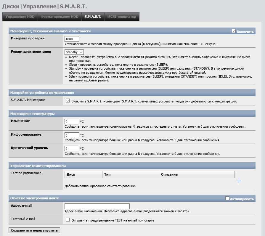 Проставьте галочку в чекбокс “Включить”, выберите режим электропитания Standby (чтобы не беспокоить винчестеры в режиме ожидания) и сохраните изменения. Также имеется возможность настройки оповещений. Теперь просмотреть подробные данные по каждому накопителю можно в разделе “Диагностика” -> “Информация” -> “S.M.A.R.T.”