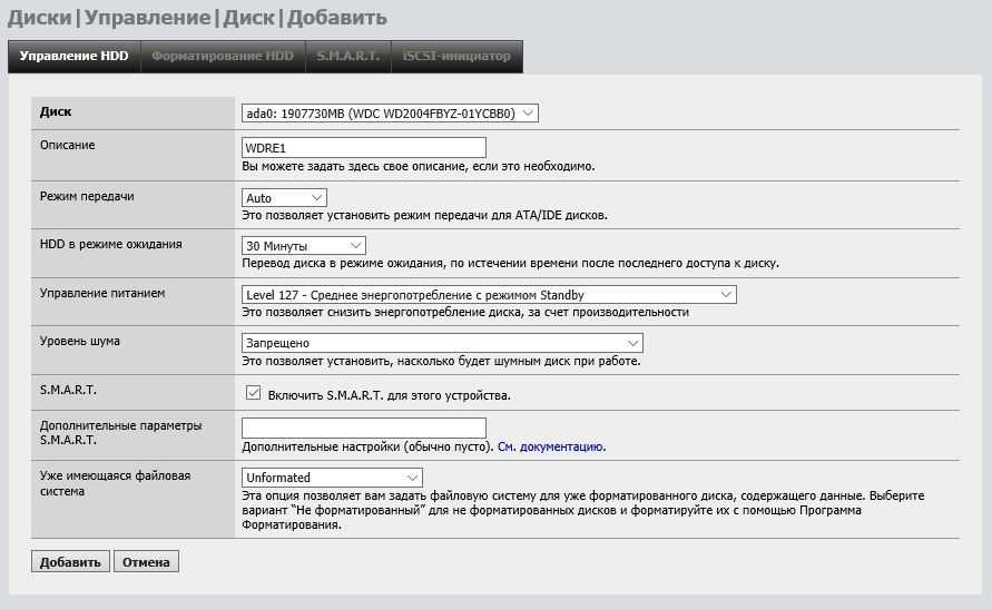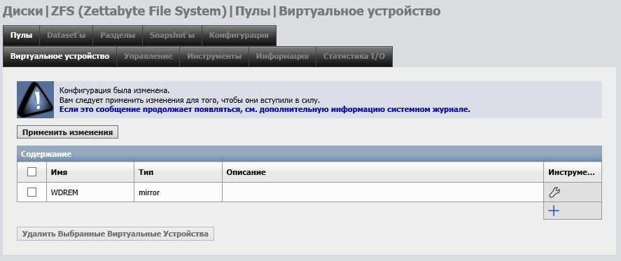 Читаем предупреждение на скриншоте. Да, такова особенность NAS4Free: сперва вносим настройки, потом подтверждаем выбор, нажав “Применить изменения” – придется привыкать. После этого наблюдаем результат своих действий:
