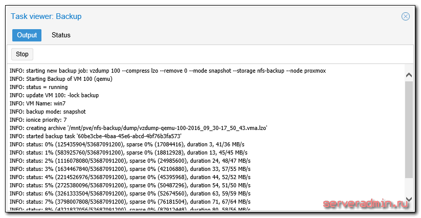 Дальше указываете необходимые параметры и дожидаетесь завершения бэкапа. Обращаю внимание, что бэкап будет выполняться при работающей виртуальной машине. Останавливаеть ее не требуется.