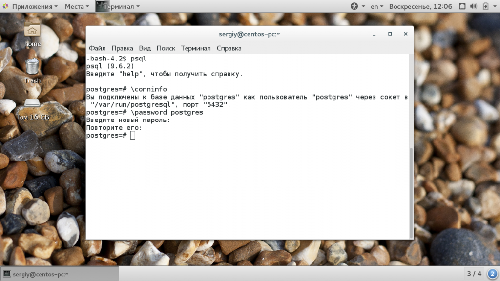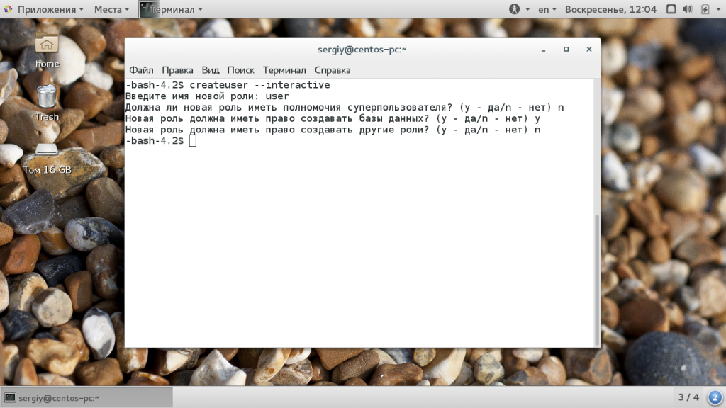 Дальше нужно ввести имя роли и ответить на несколько вопросов, а также повторить процедуру задания пароля как для postgres. Чтобы вы могли использовать postgresql через терминал от имени этого пользователя добавьте пользователя UNIX:
