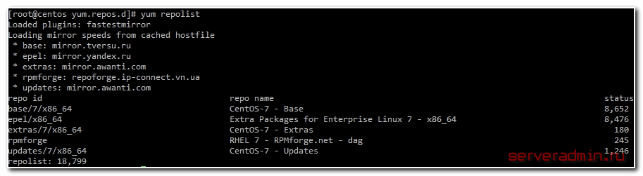 yum repolist Loaded plugins: fastestmirror Loading mirror speeds from cached hostfile * base: mirror.yandex.ru * epel: fedora-mirror01.rbc.ru * extras: mirror.yandex.ru * updates: mirror.yandex.ru repo id repo name status base/7/x86_64 CentOS-7 - Base 9,007 epel/x86_64 Extra Packages for Enterprise Linux 7 - x86_64 10,580 extras/7/x86_64 CentOS-7 - Extras 390 updates/7/x86_64 CentOS-7 - Updates 2,469 repolist: 22,446