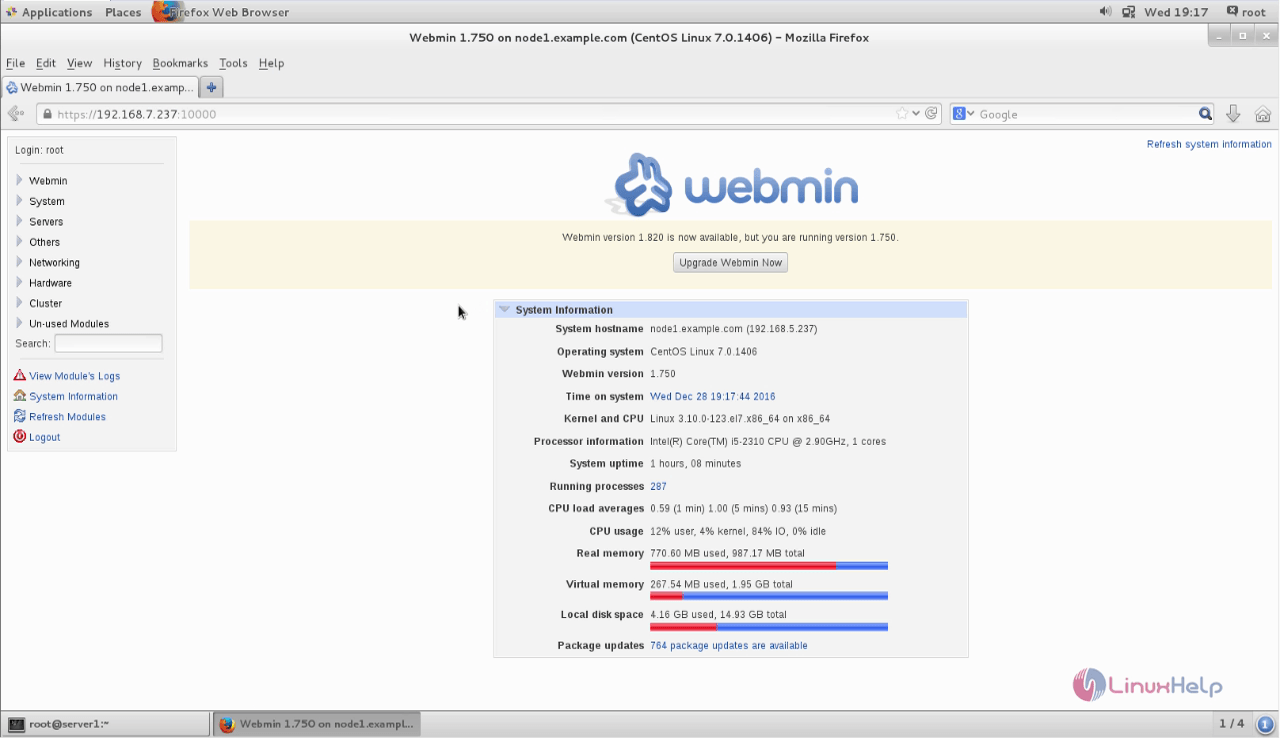~]# yum install http://download.webmin.com/download/yum/webmin-1.750-1.noarch.rpm Loaded plugins: fastestmirror, langpacks webmin-1.750-1.noarch.rpm | 25 MB 00:09:24 Examining /var/tmp/yum-root-N_UXj4/webmin-1.750-1.noarch.rpm: webmin-1.750-1.noarch Marking /var/tmp/yum-root-N_UXj4/webmin-1.750-1.noarch.rpm to be installed Resolving Dependencies --> Running transaction check ---> Package webmin.noarch 0:1.750-1 will be installed --> Finished Dependency Resolution Dependencies Resolved . . . Operating system is CentOS Linux Installing : webmin-1.750-1.noarch 1/1 Webmin install complete. You can now login to https://node1.example.com:10000/ as root with your root password. Verifying : webmin-1.750-1.noarch 1/1 Installed: webmin.noarch 0:1.750-1 Complete!