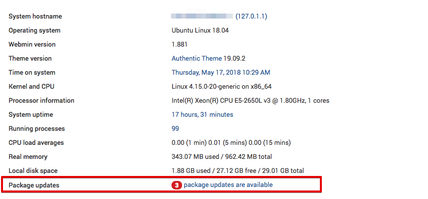 Webmin le permite actualizar todos sus paquetes a través de su interfaz de usuario. Para actualizar todos sus paquetes, haga clic en el enlace Panel y luego localice el campo Actualizaciones de paquetes. Si hay actualizaciones disponibles, verá un enlace que indicará el número de actualizaciones disponibles, como se muestra en la siguiente figura: