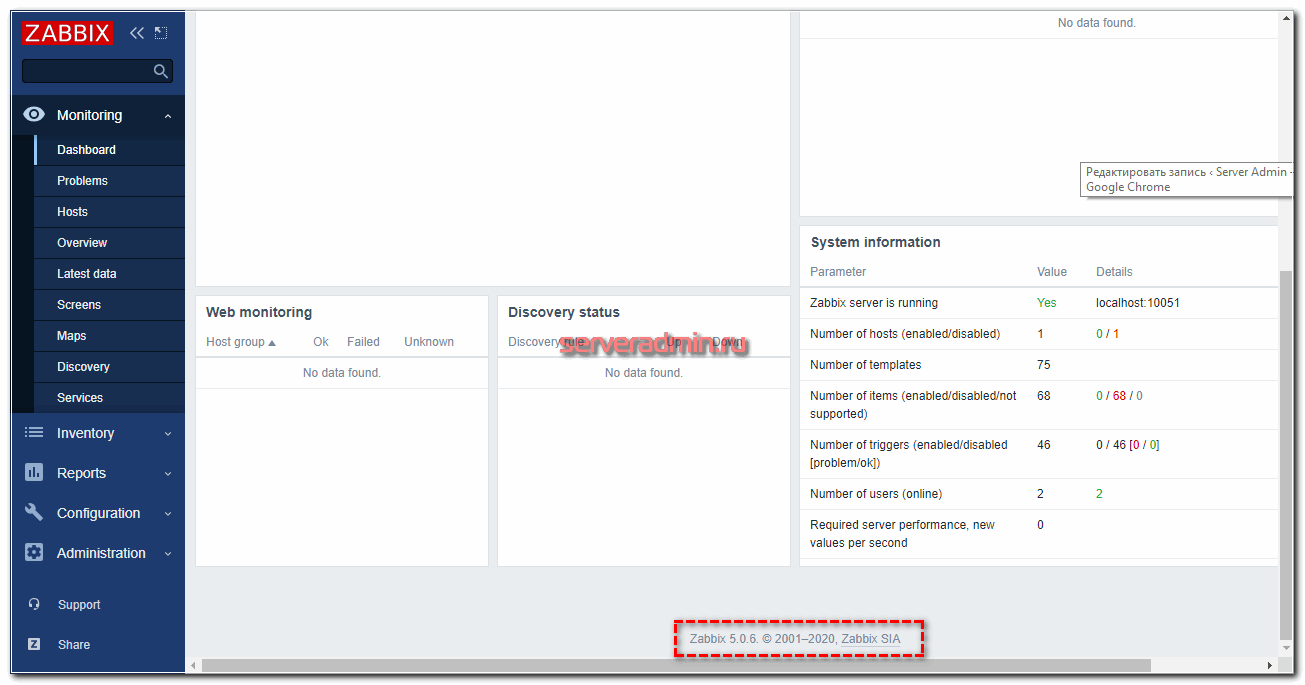 Теперь можно произвести первый логин через веб-интерефс Zabbix. Для входа необходимо использовать логин Admin (с большой буквы), пароль — zabbix.