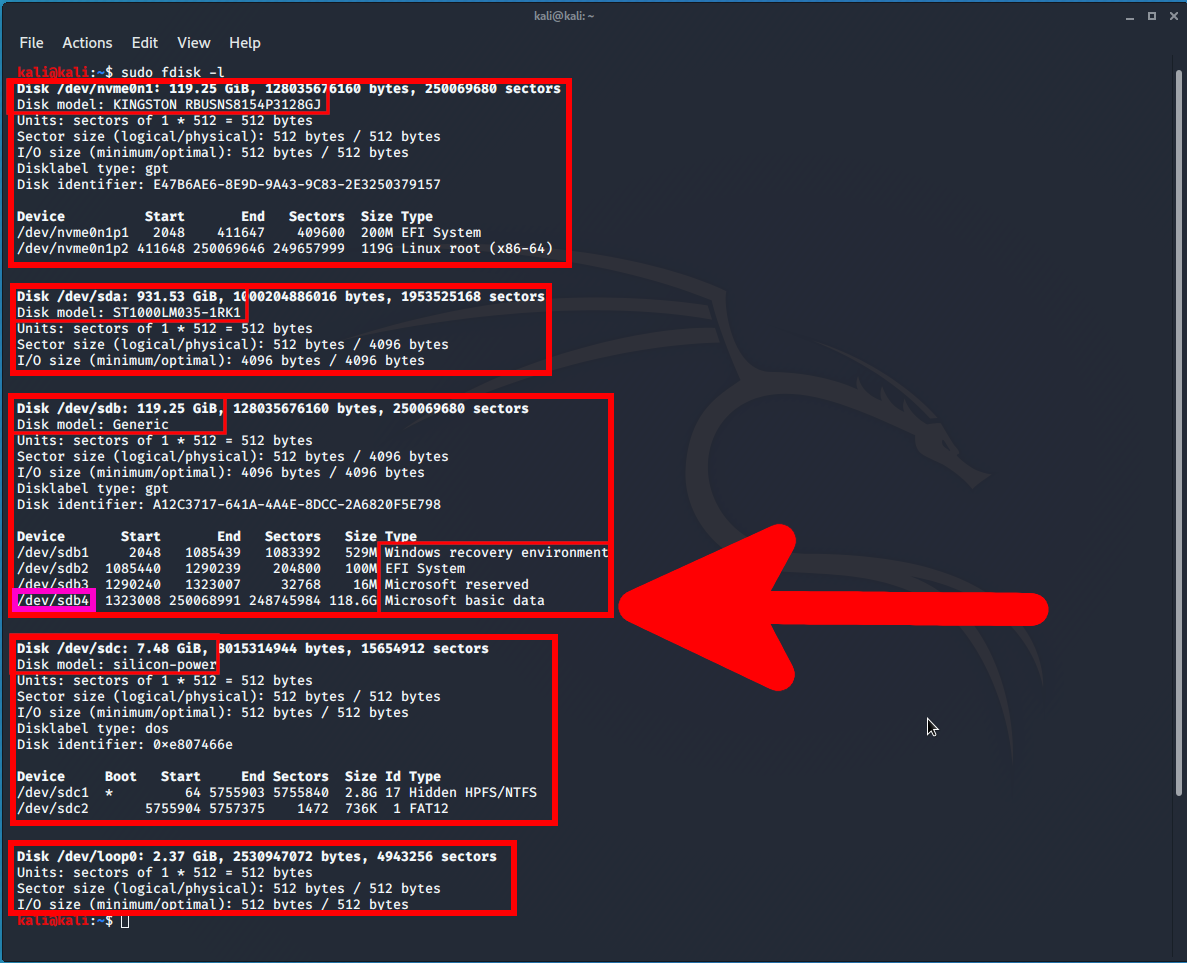 На мой диск с Windows указывает стрелка на скриншоте. Нам нужно было узнать имя диска и имя раздела «Microsoft basic data», в моём случае это /dev/sdb4. Это самый большой раздел. На более старых версиях Windows может быть меньше разделов.