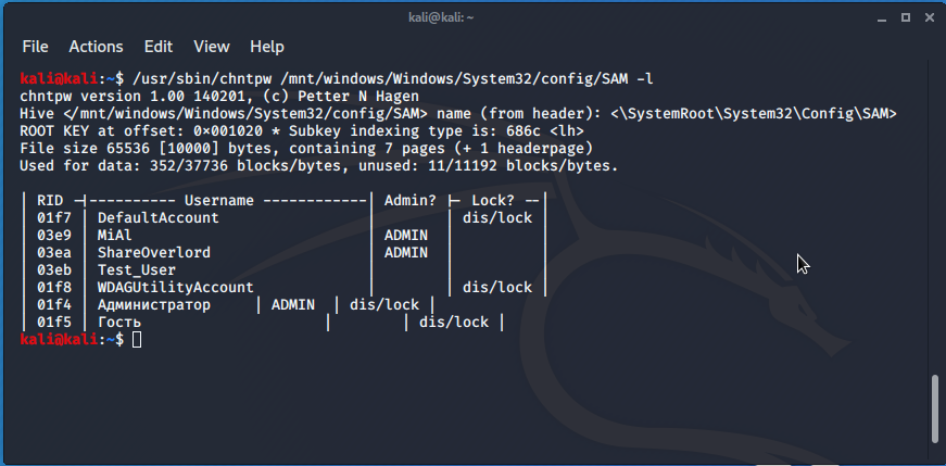 | RID -|---------- Username ------------| Admin? |- Lock? --| | 01f7 | DefaultAccount | | dis/lock | | 03e9 | MiAl | ADMIN | | | 03ea | ShareOverlord | ADMIN | | | 03eb | Test_User | | | | 01f8 | WDAGUtilityAccount | | dis/lock | | 01f4 | Администратор | ADMIN | dis/lock | | 01f5 | Гость | | dis/lock |