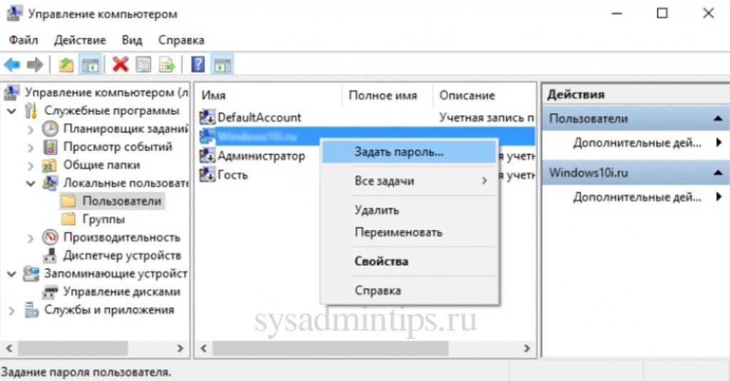 Теперь, согласно скриншоту, следует зайти в контекстное меню нужной учетной записи и задать пароль.