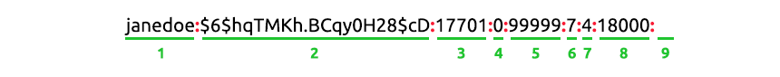 - Пароль в зашифрованном виде: если стоит !!, то пароль не был создан. Формат пароля — . показывает каким методом был зашифрован пароль:$1 — MD5.$2a — Blowfish.$2y — Blowfish.$5 — SHA-256.$6 — SHA-512 (наиболее предпочтительный).