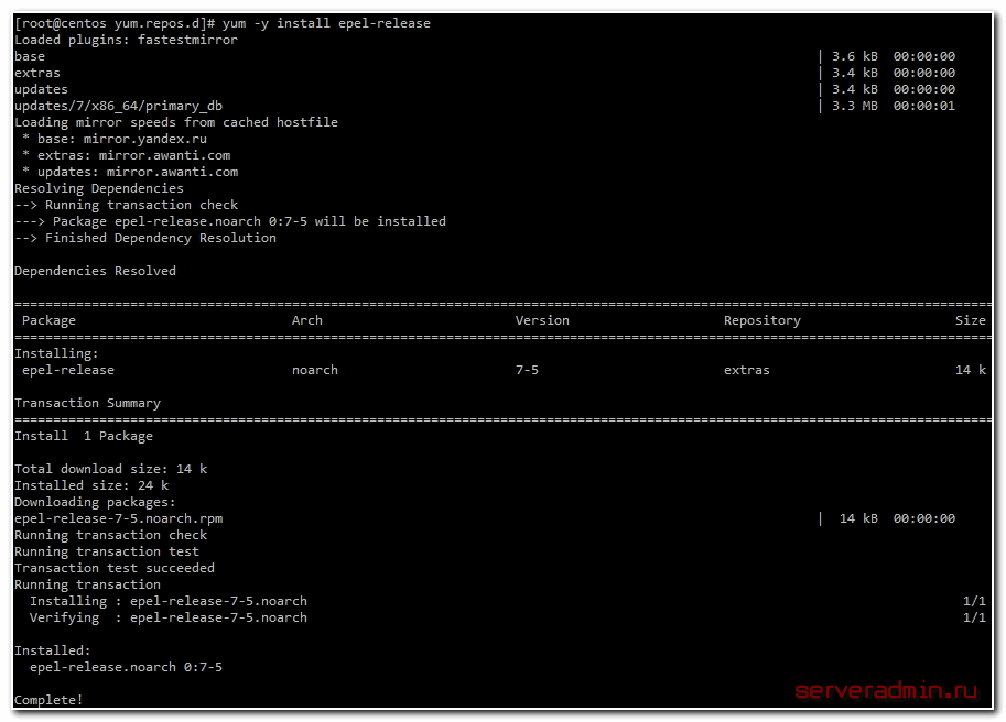 EPEL — самый простой в установке репозиторий. Epel-release package включен в стандартный Extras repository и доступен по умолчанию. Для его установки достаточно выполнить команду: