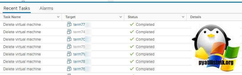 Если в этот момент посмотреть vCenter, то тут вы увидите массовые задания по удалению.