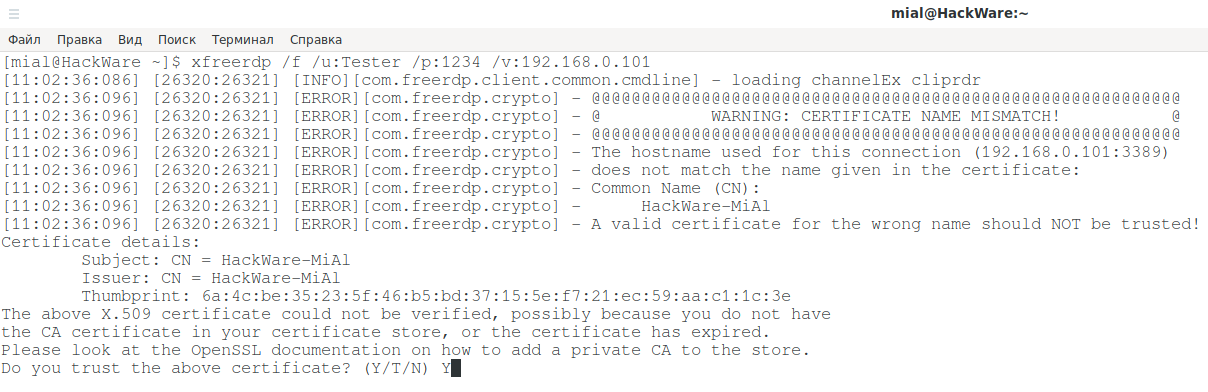 - loading channelEx cliprdr - @@@@@@@@@@@@@@@@@@@@@@@@@@@@@@@@@@@@@@@@@@@@@@@@@@@@@@@@@@@ - @ WARNING: CERTIFICATE NAME MISMATCH! @ - @@@@@@@@@@@@@@@@@@@@@@@@@@@@@@@@@@@@@@@@@@@@@@@@@@@@@@@@@@@ - The hostname used for this connection (192.168.0.101:3389) - does not match the name given in the certificate: - Common Name (CN): - HackWare-MiAl - A valid certificate for the wrong name should NOT be trusted! Certificate details: Subject: CN = HackWare-MiAl Issuer: CN = HackWare-MiAl Thumbprint: 6a:4c:be:35:23:5f:46:b5:bd:37:15:5e:f7:21:ec:59:aa:c1:1c:3e The above X.509 certificate could not be verified, possibly because you do not have the CA certificate in your certificate store, or the certificate has expired. Please look at the OpenSSL documentation on how to add a private CA to the store. Do you trust the above certificate? (Y/T/N)