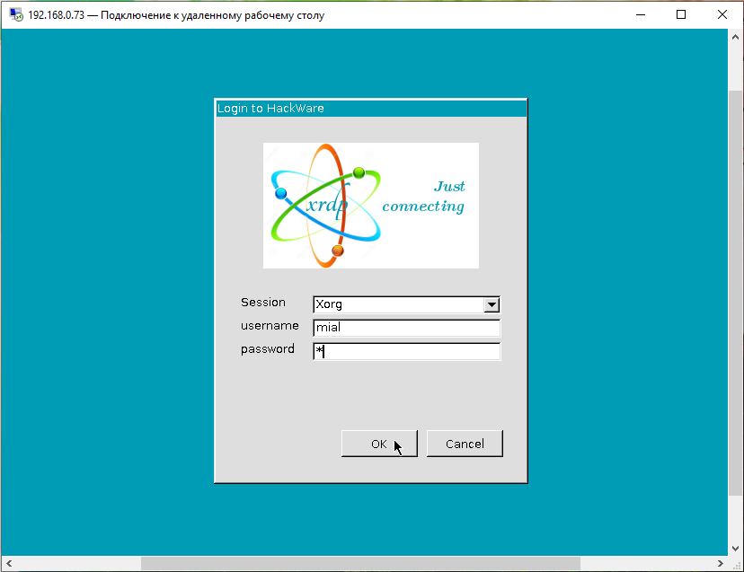 Подключаемся из Windows к xrdp. Вводим имя пользователя и пароль пользователя Linux: