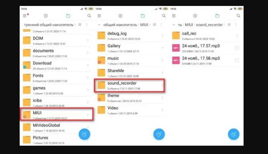 Все записанные файлы сохранены в утилите Проводник. Иконка утилиты находится в верхней части главного экрана. Иконка в виде папки раскрывается списком, среди которых есть файл MIUI. После нажатия на этот файл пользователь найдет записанные телефонные разговоры.