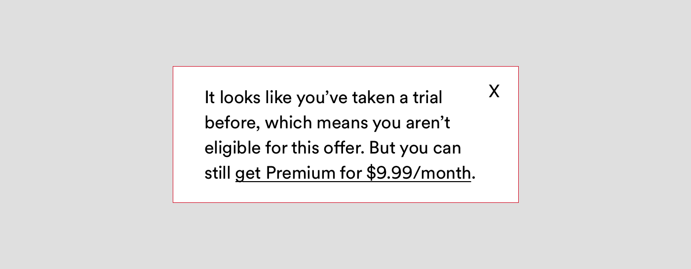 Представьте, что вы используйте пробную версию Spotify Premium. Затем вы попадаете на страницу и видите что-то вроде этого сообщения: