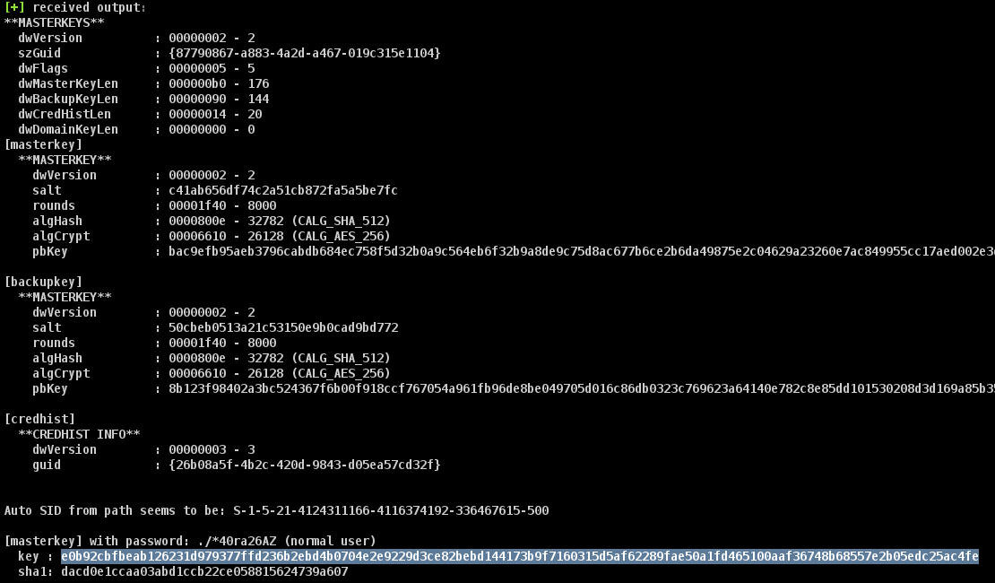 Вся дальнейшая работа по восстановлению данных будет производится с помощью mimikatz. Давайте получим мастер ключ (повезло, он был в первом хранилище).