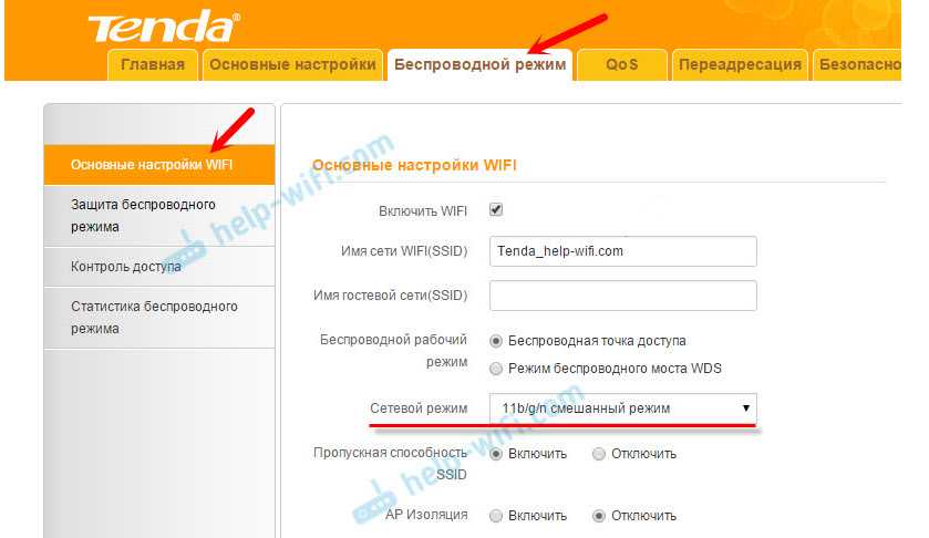 Настройка сетевого режима Wi-Fi на роутере Tenda