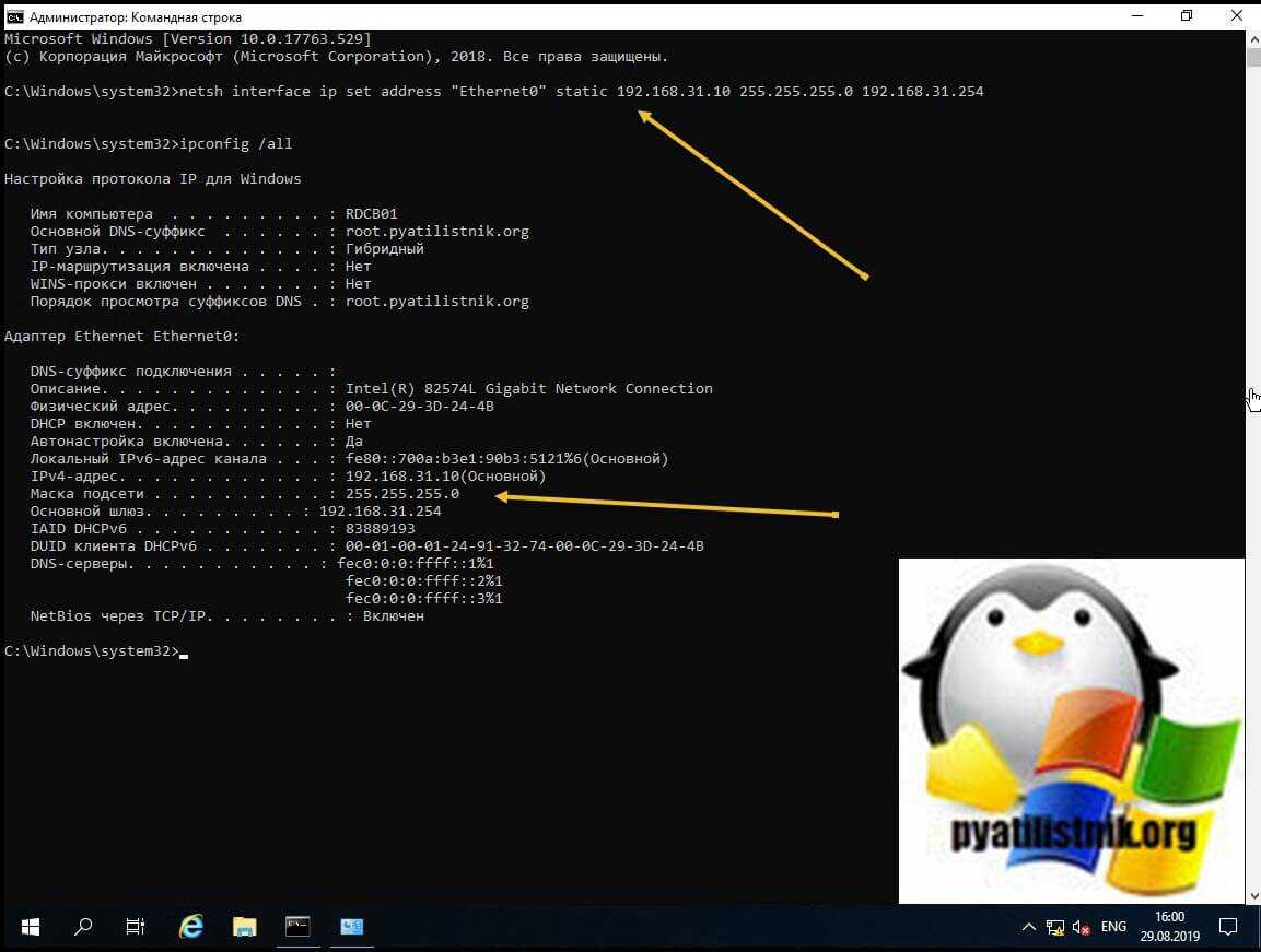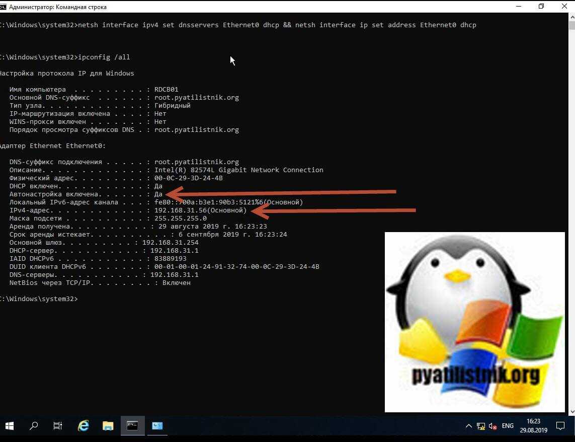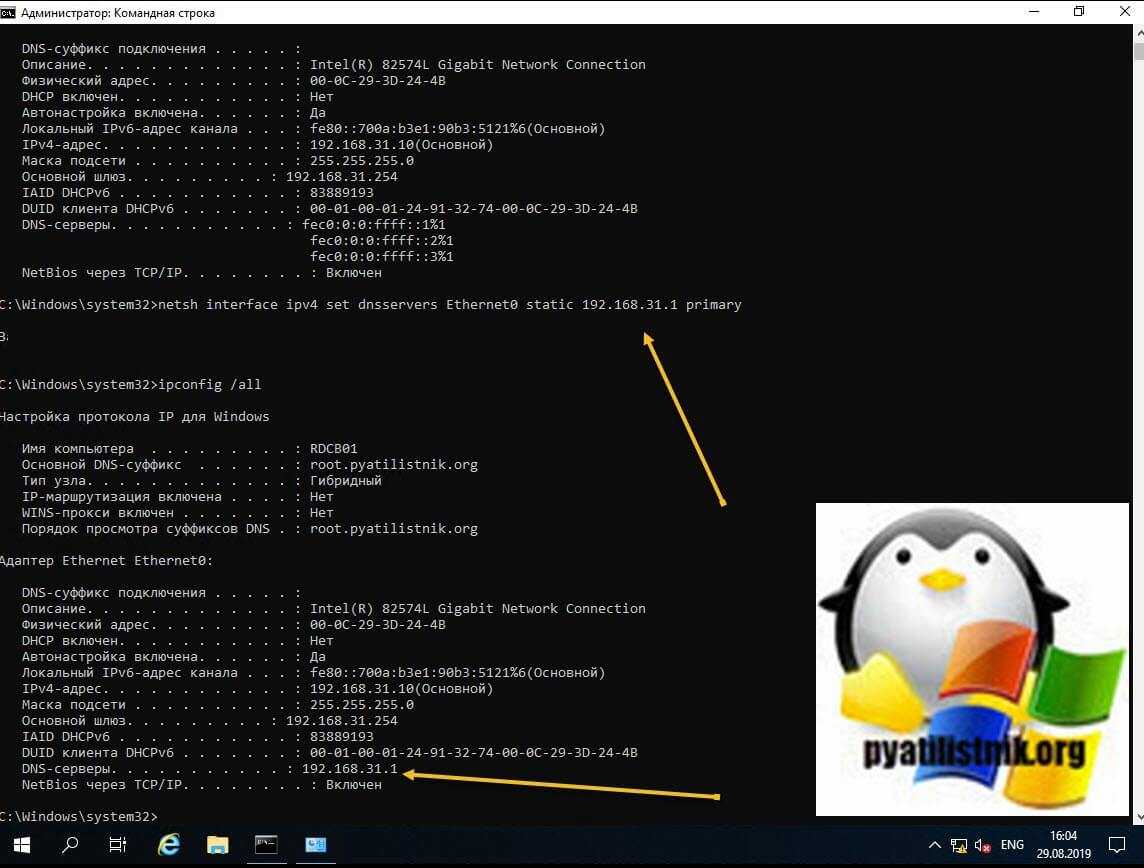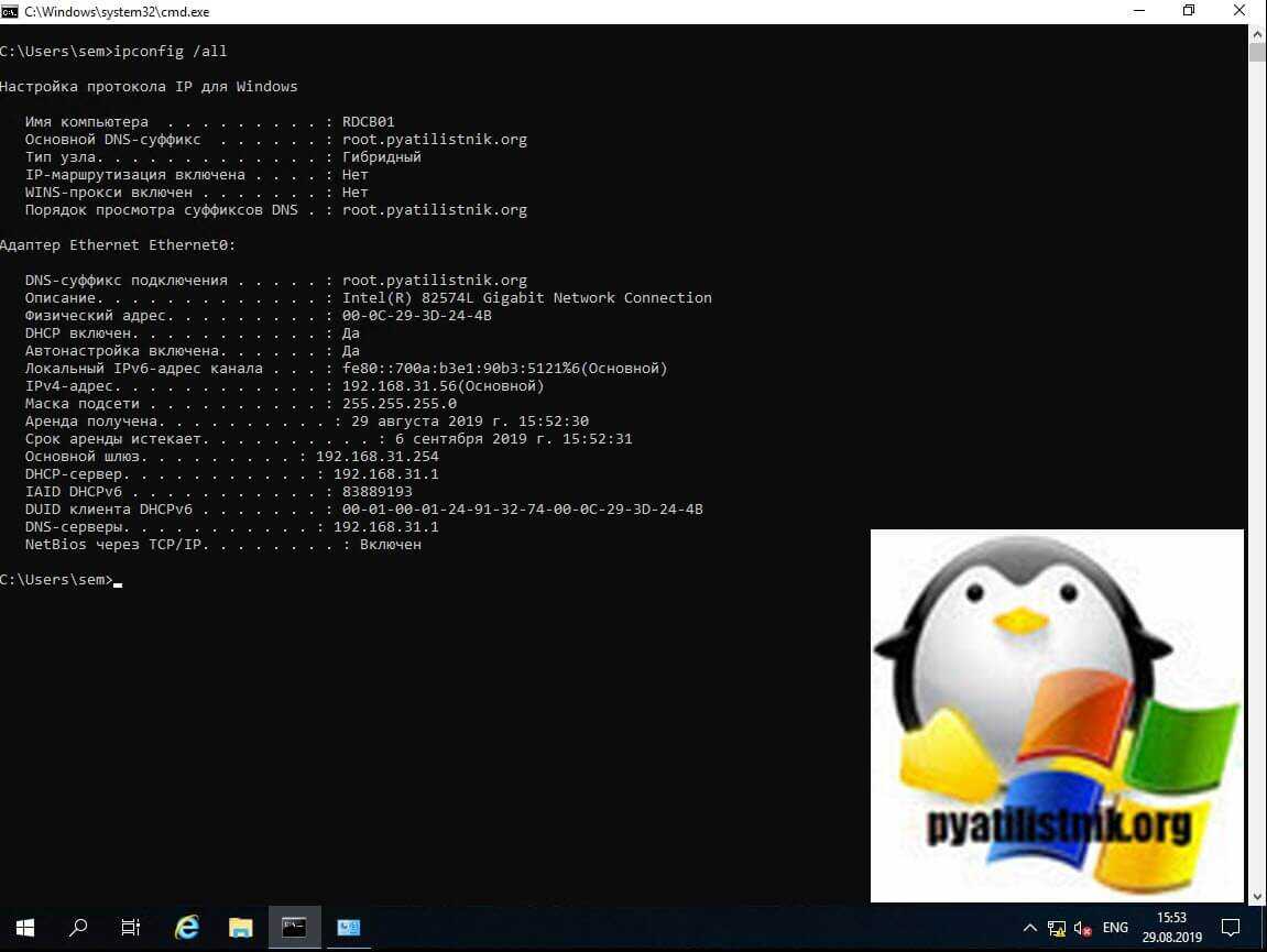 Сохраняем все настройки и проверяем через Ipconfig /all, что все видится. Так же можете попробовать пропинговать ваш основной шлюз или DNS-сервер. На этом графическая настройка сети в Windows Server 2019 окончена.