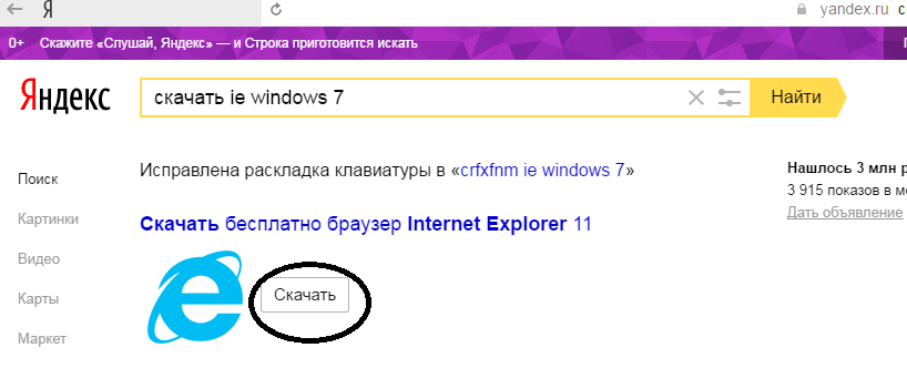 Идем в интернет, в поисковой строке набираем: «Скачать IE для Windows 7». Вот такая картина: