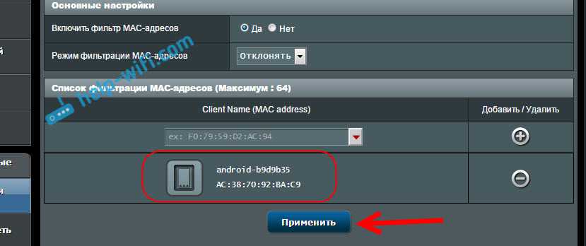 Добавленный клиент появится в списке. Что бы сохранить, нажмите на кнопку Применить. Устройство будет отключено от вашей Wi-Fi сети, и не сможет к ней подключится, пока вы его не разблокируете.