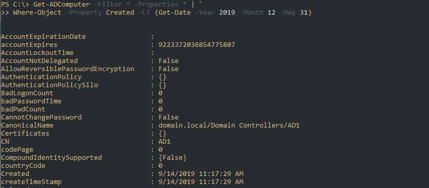 | 1 | Get-ADComputer-Filter *-Properties *|` Where-Object-PropertyCreated-LT(Get-Date-Year2019-Month12-Day31) |