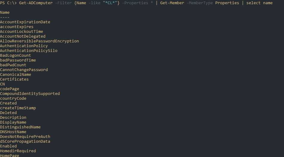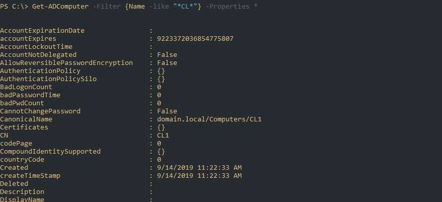 | 1 | Get-ADComputer-Filter{Name-like»*CL*»}-Properties * |