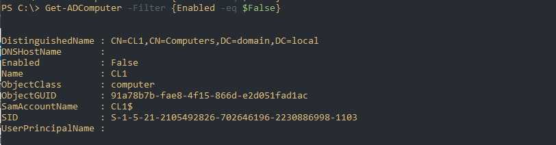 | 1 | Get-ADComputer-Filter{Enabled-eq$False} |