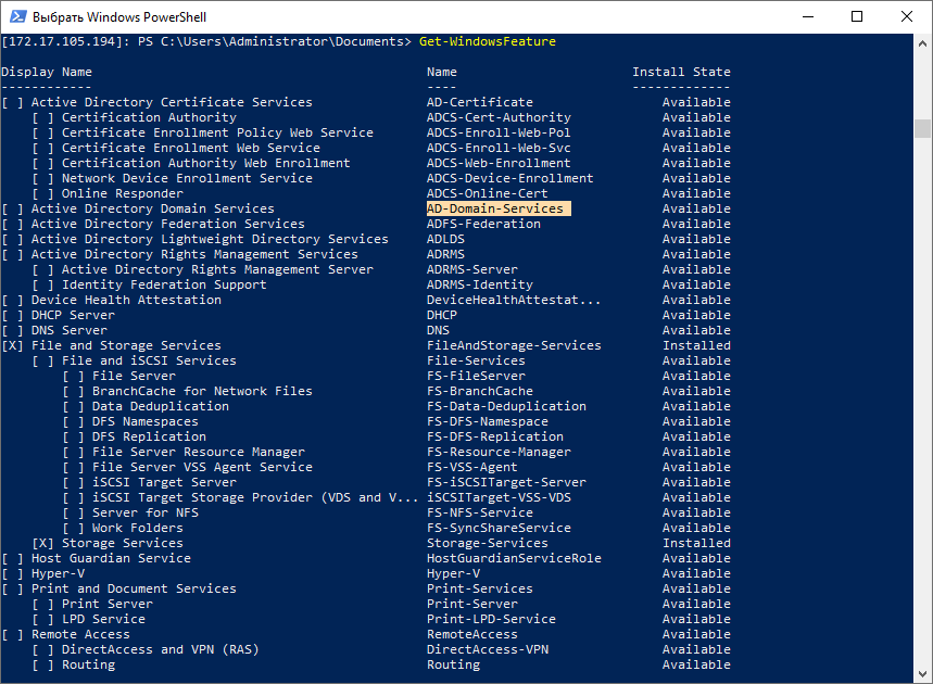 Копируем имя компонента и приступаем к установке. Install-WindowsFeature -Name AD-Domain-Services Windows Admin Center: