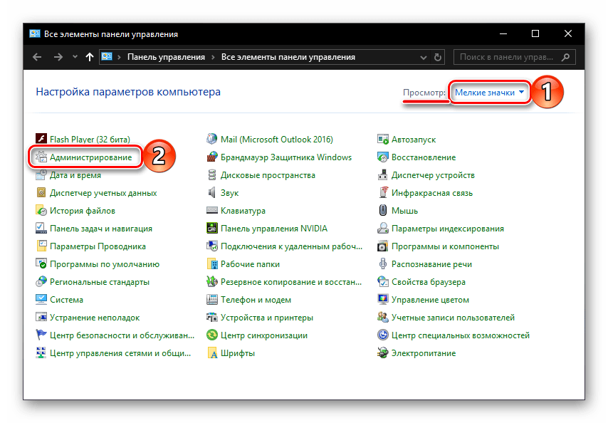 Найдите раздел «Администрирование» и перейдите в него, кликнув левой кнопкой мышки (ЛКМ) по соответствующему наименованию. Если потребуется, предварительно измените режим просмотра «Панели» на «Мелкие значки».